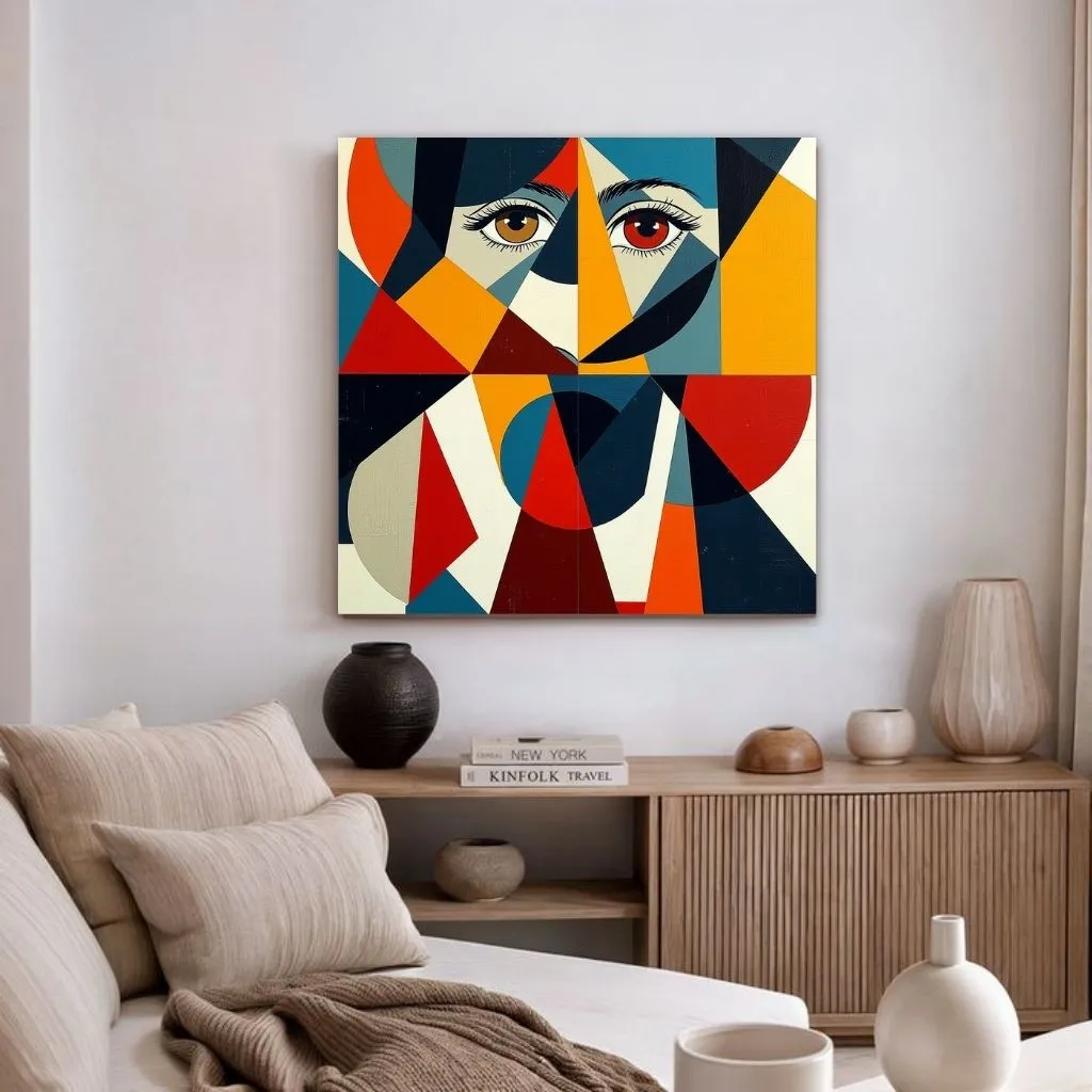 ترکیبی چشمگیر از اشکال هندسی و رنگهای متضاد که چهرهای انتزاعی و پرمفهوم را در مرکز قاب شکل داده است؛ انتخابی جسورانه برای دکوراسیونهای مدرن و هنردوست.