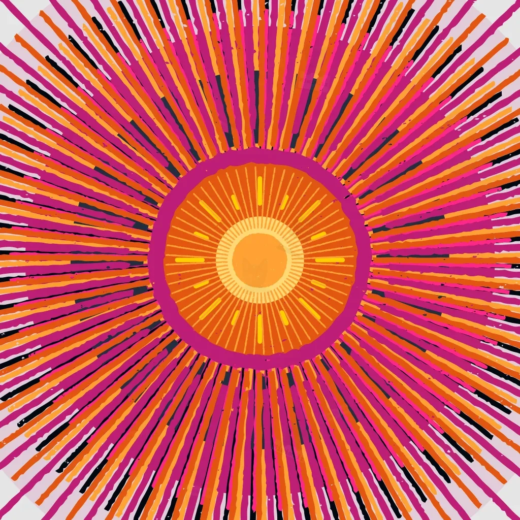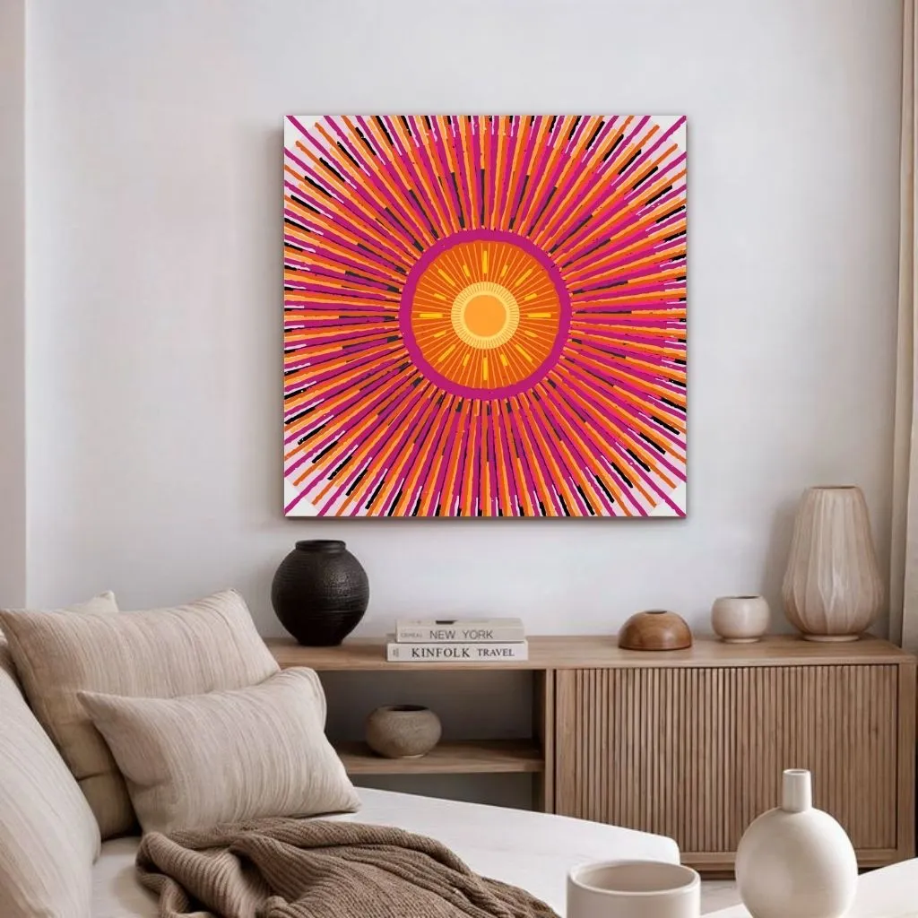 اطراف این مرکز، گلبرگهایی باریک و راهراه در طیفهای صورتی، نارنجی و مشکی بهصورت متقارن چیده شدهاند که حالتی ستارهوار و پرحرکت را تداعی میکنند. پسزمینهی خاکستری روشن، با ایجاد تضاد بصری، به برجستهسازی رنگها و فرمها کمک میکند. این تابلو با طراحی جسورانه و رنگهای گرم و متضاد، انتخابی عالی برای فضاهای مدرن، خلاقانه یا الهامبخش است.