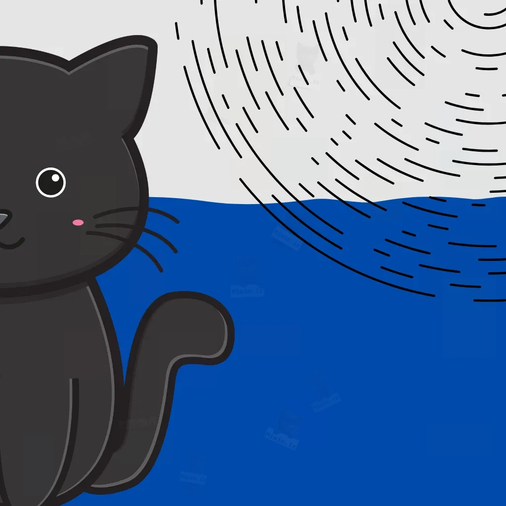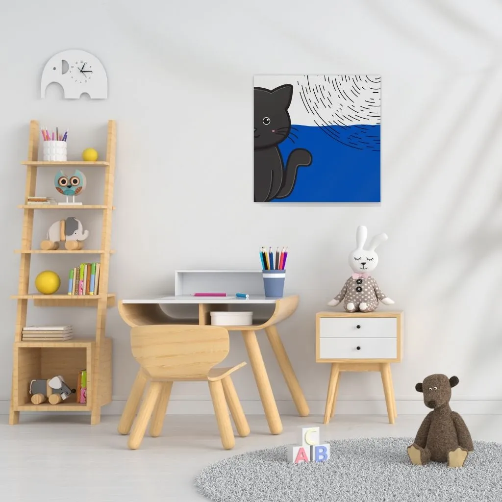 تابلوی «گربه سیاه در پسزمینه آبی» اثری فانتزی و سرشار از لطافت است که با رنگها و فرمهای ساده، حسی گرم و دوستداشتنی به فضا میبخشد. گربهای سیاه با صورتی گرد، چشمانی درشت و دمی حلقهشده، در مرکز تصویر نشسته است. پسزمینه از ترکیب آبی و سفید به شکل گرادیان ساخته شده و در گوشه بالا سمت راست، موجی از خطوط نازک و منحنی، پویایی و انرژی اثر را تقویت میکند.