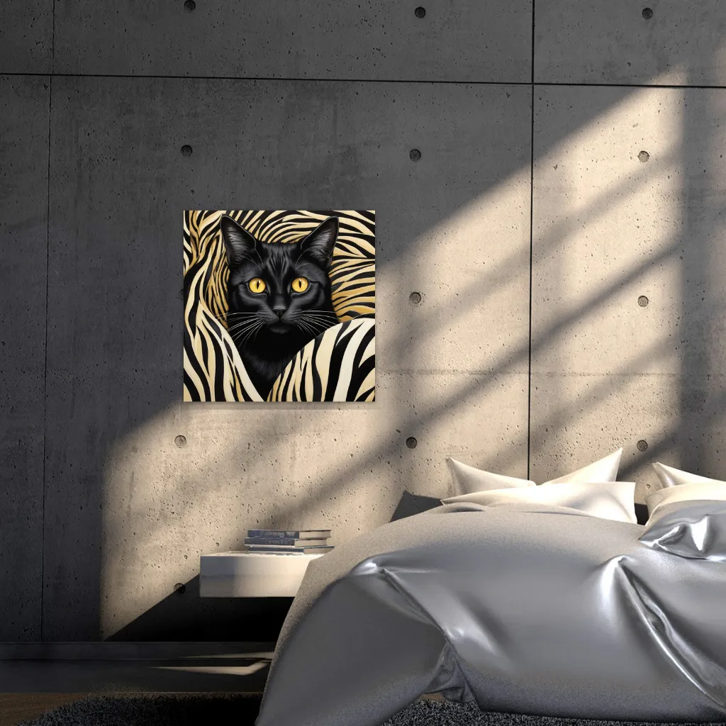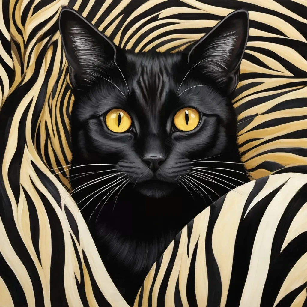 تابلوی «گربه سیاه در پناه طرح گورخری» یک تصویر دیجیتال منحصربهفرد است که نمایی نزدیک از چهرهی یک گربه سیاه را به تصویر میکشد. این گربه با چشمان زرد درخشان، نگاه مستقیم و نافذی به بیننده دارد. بافت نرم و براق موهایش در کنار سبیلهای ظریف و گوشهای برافراشته، حالتی همزمان آرام و هوشیار را القا میکند.