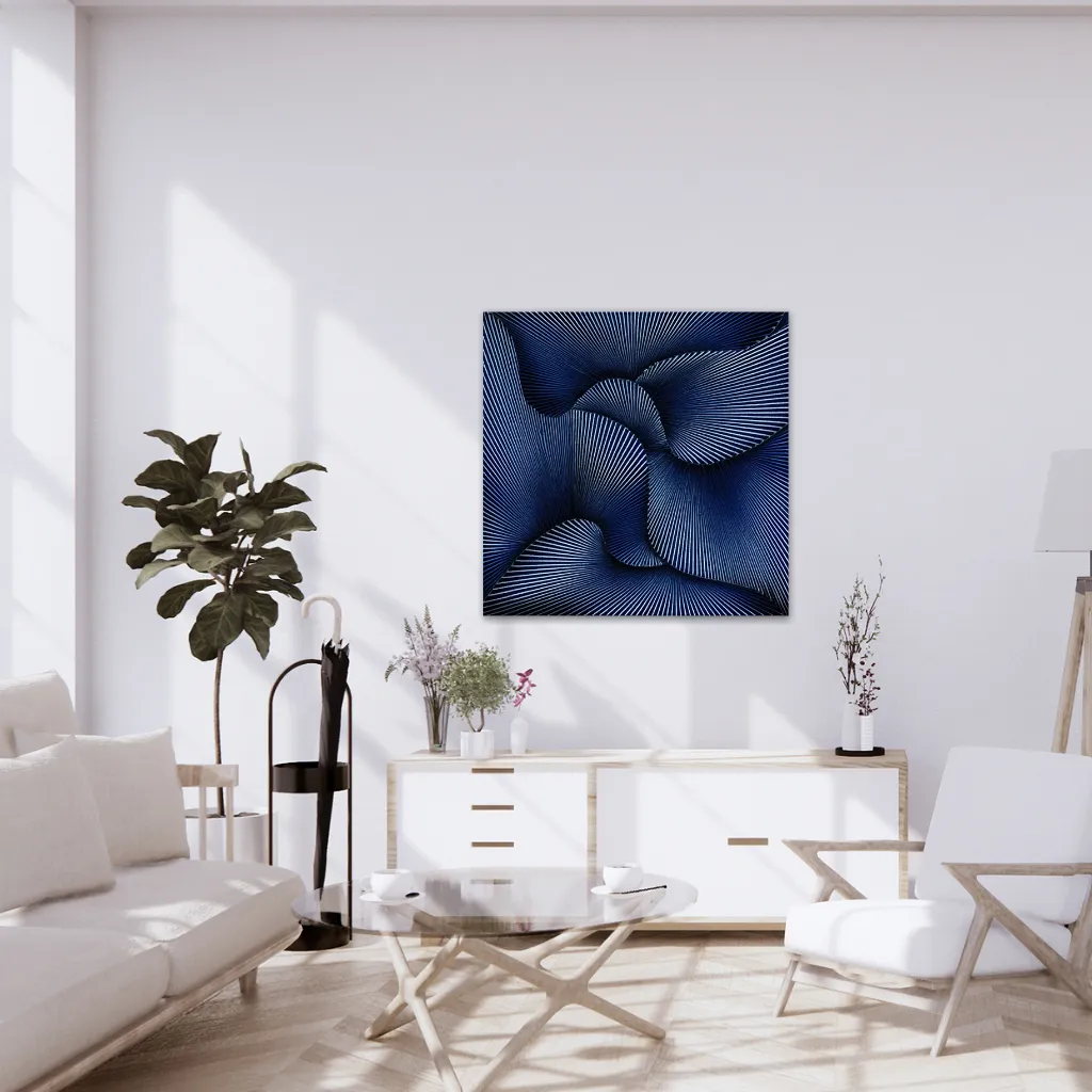 تابلوی «خطوط فراکتالی آبی و سفید» اثری انتزاعی و مدرن است که با استفاده از خطوط منحنی و الگوی شعاعی، عمق و بعدی بصری چشمگیر ایجاد میکند. خطوط آبی و سفید با ضخامتها و عرضهای متفاوت، همپوشانی میکنند و ترکیبی از حرکت، ریتم و توهم بصری به وجود میآورند.