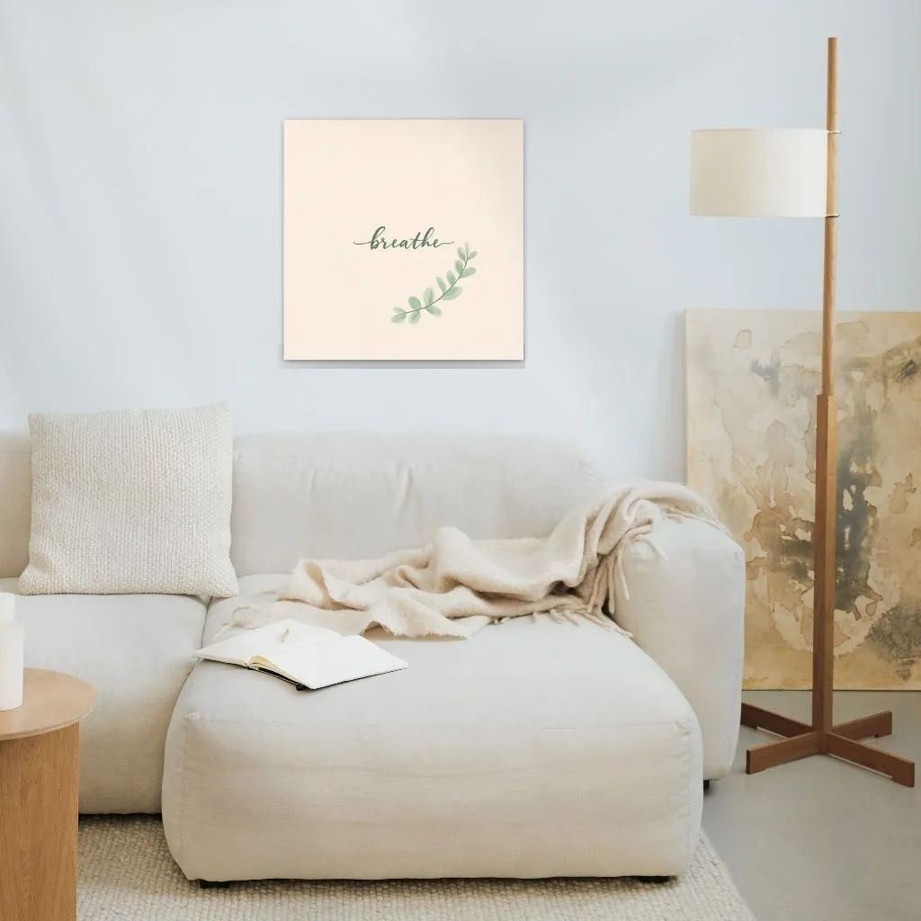 تابلوی «نفس بکش» اثری مینیمال با پیامی ساده اما عمیق است. در مرکز تصویر، کلمهی *breathe* با فونتی دستنویس و خوشخط به رنگ مشکی نوشته شده که به زیبایی با زمینهی هلویی روشن هماهنگ شده است.
