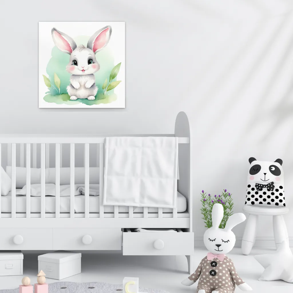 خرگوش روی پاهای عقبی نشسته و دستهای کوچکش زیر بدن جمع شدهاند، حالتی که او را دوستداشتنیتر نشان میدهد. پسزمینه با طیفی ملایم از سبز روشن و آبی روشن، فضایی آرام و هماهنگ ایجاد کرده است. برگهای سبز پراکنده در اطراف خرگوش نیز حالوهوایی طبیعی و شاداب به اثر بخشیدهاند. این تابلو انتخابی فوقالعاده برای دکوراسیون اتاق کودکان، فضاهای فانتزی یا محیطهایی است که به دنبال القای حس نشاط و لطافت هستند.