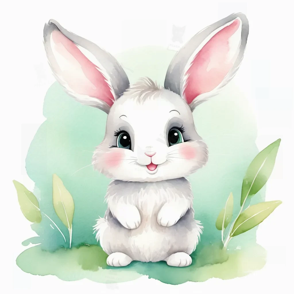 تصویر کارتونی و شیرین از خرگوشی سفید و خاکستری با چشمهای سبز در پسزمینهای ملایم و برگهای سبز؛ انتخابی شاد و دوستداشتنی برای هر فضایی.