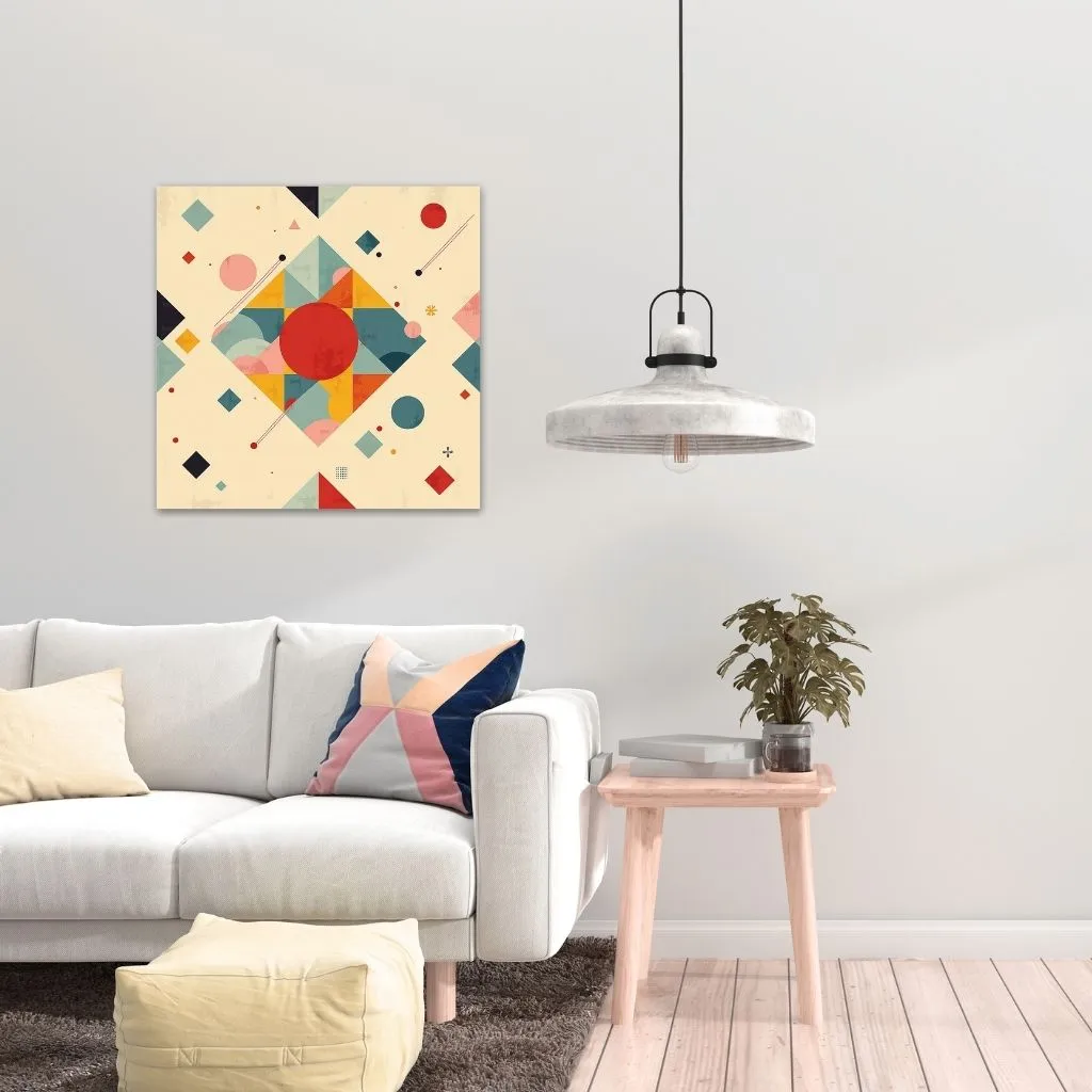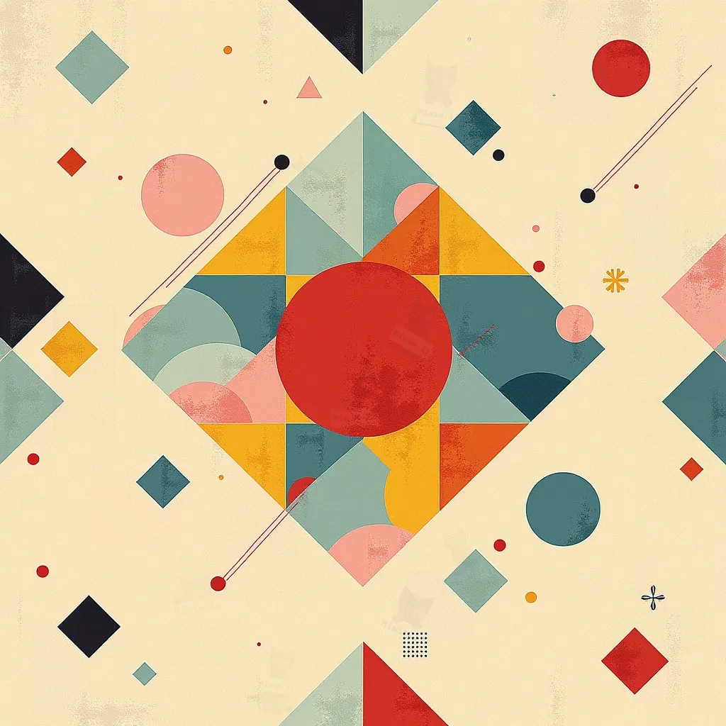 ترکیبی متعادل از اشکال هندسی پاستلی با محوریت یک دایرهی قرمز؛ انتخابی زیبا برای علاقهمندان به هنر مدرن و طراحی مینیمال.
