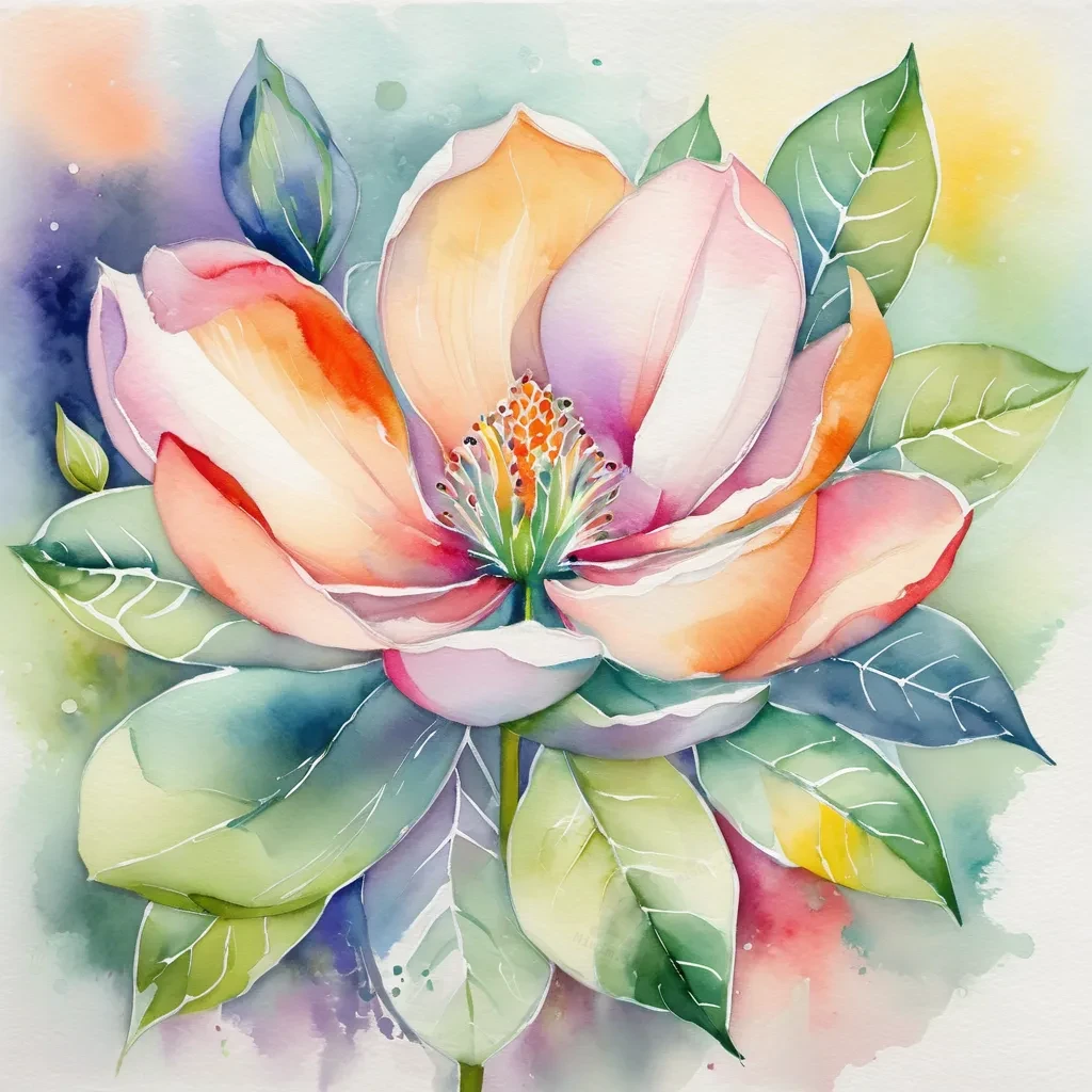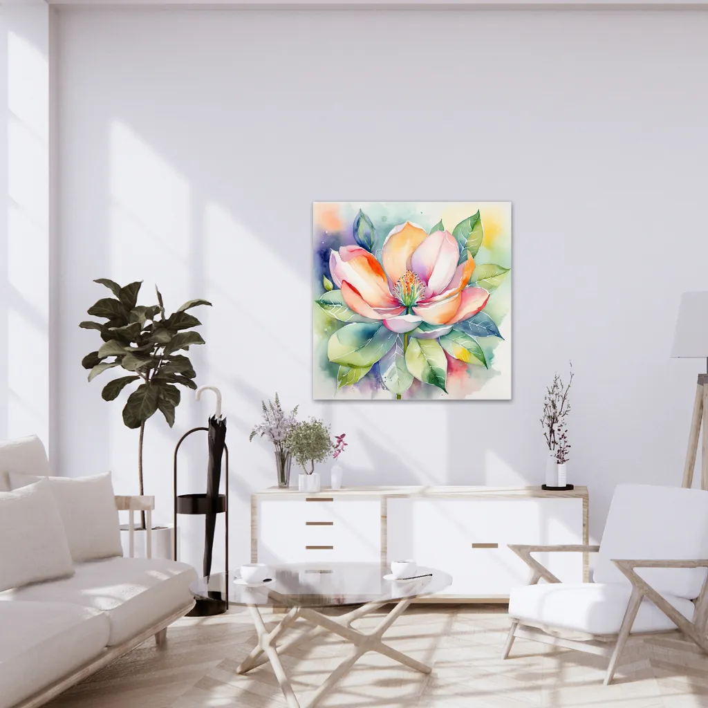 تابلوی «شکوفه ماگنولیا در پسزمینه پاستلی» اثری چشمنواز در سبک آبرنگ است که زیبایی طبیعی و آرامش را به تصویر میکشد. در مرکز اثر، شکوفهای بزرگ و ظریف از ماگنولیا با گلبرگهایی در طیف صورتی و نارنجی خودنمایی میکند. برگهای سبز، به شکلی متقارن و متوازن پیرامون شکوفه چیده شدهاند و جلوهای هماهنگ به اثر میبخشند.