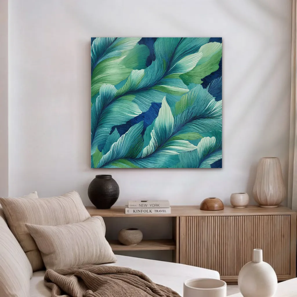 تابلوی «پرهای فیروزهای در پسزمینه آبی» اثری جذاب با بافتی ارگانیک و رویایی است. طرحی انتزاعی از برگها و پرهایی ظریف، در طیفی از رنگهای فیروزهای و سفید، با پسزمینهای سرمهای عمیق ترکیب شده است. این کنتراست رنگی، همزمان حس آرامش و انرژی را به بیننده منتقل میکند.