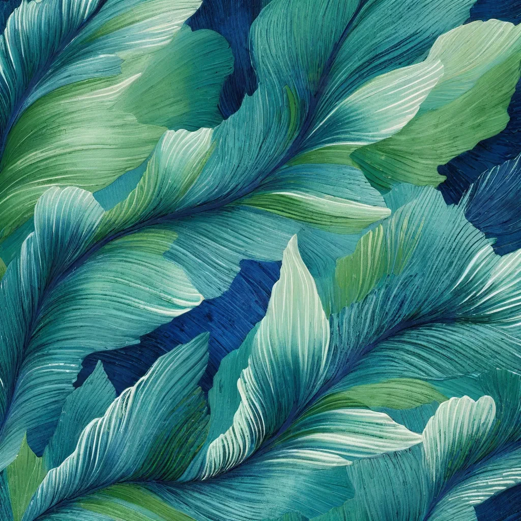 الگویی انتزاعی از برگها و پرهای فیروزهای در پسزمینه سرمهای؛ انتخابی شیک و چشمنواز برای فضاهای مدرن و آرامشبخش.