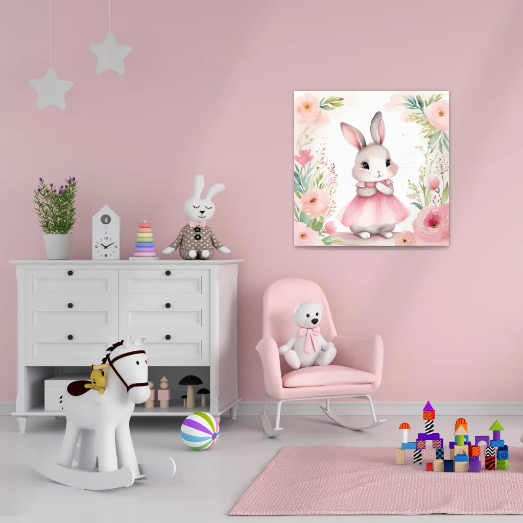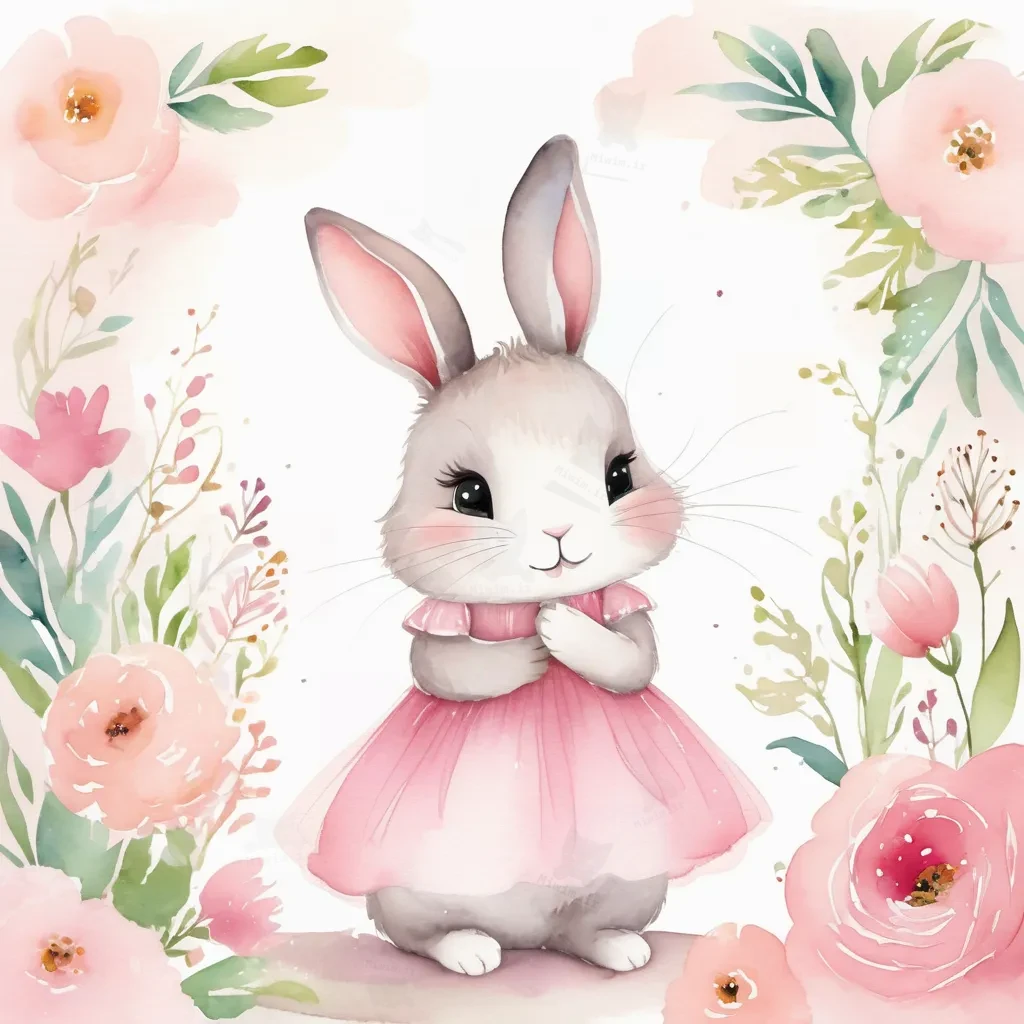 تصویر آبرنگی و کارتونی از خرگوشی بامزه با لباس صورتی، احاطهشده با گلهای لطیف؛ انتخابی شاعرانه و دوستداشتنی برای فضاهای صمیمی.