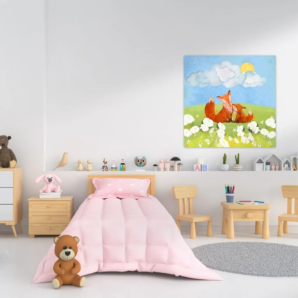 این تصویر زیبا و خیالانگیز حس آرامش، عشق مادرانه و لذت از لحظات ساده زندگی را القا میکند. رنگهای پاستلی، ترکیب هوشمندانه طبیعت با سبک کودکانه و فانتزی، این اثر را به انتخابی عالی برای اتاق کودک، فضای نشیمن یا محیطهایی که به دنبال انرژی مثبت و حس امنیت هستند، تبدیل کرده است.