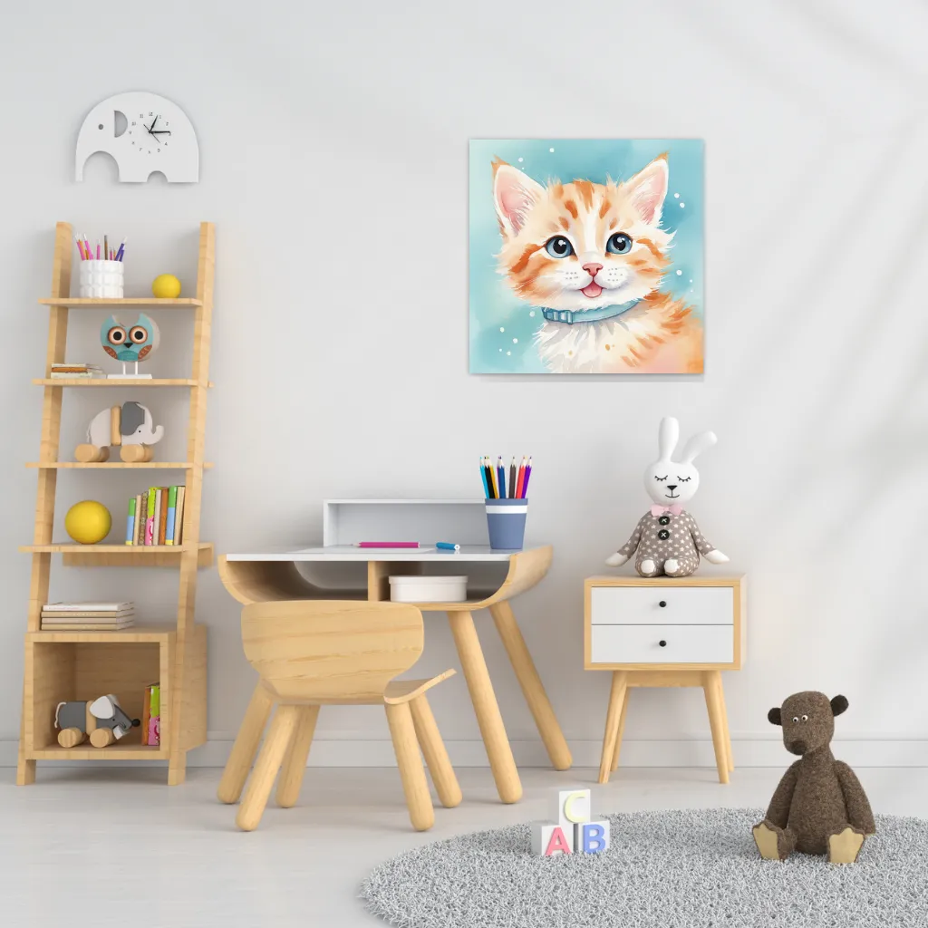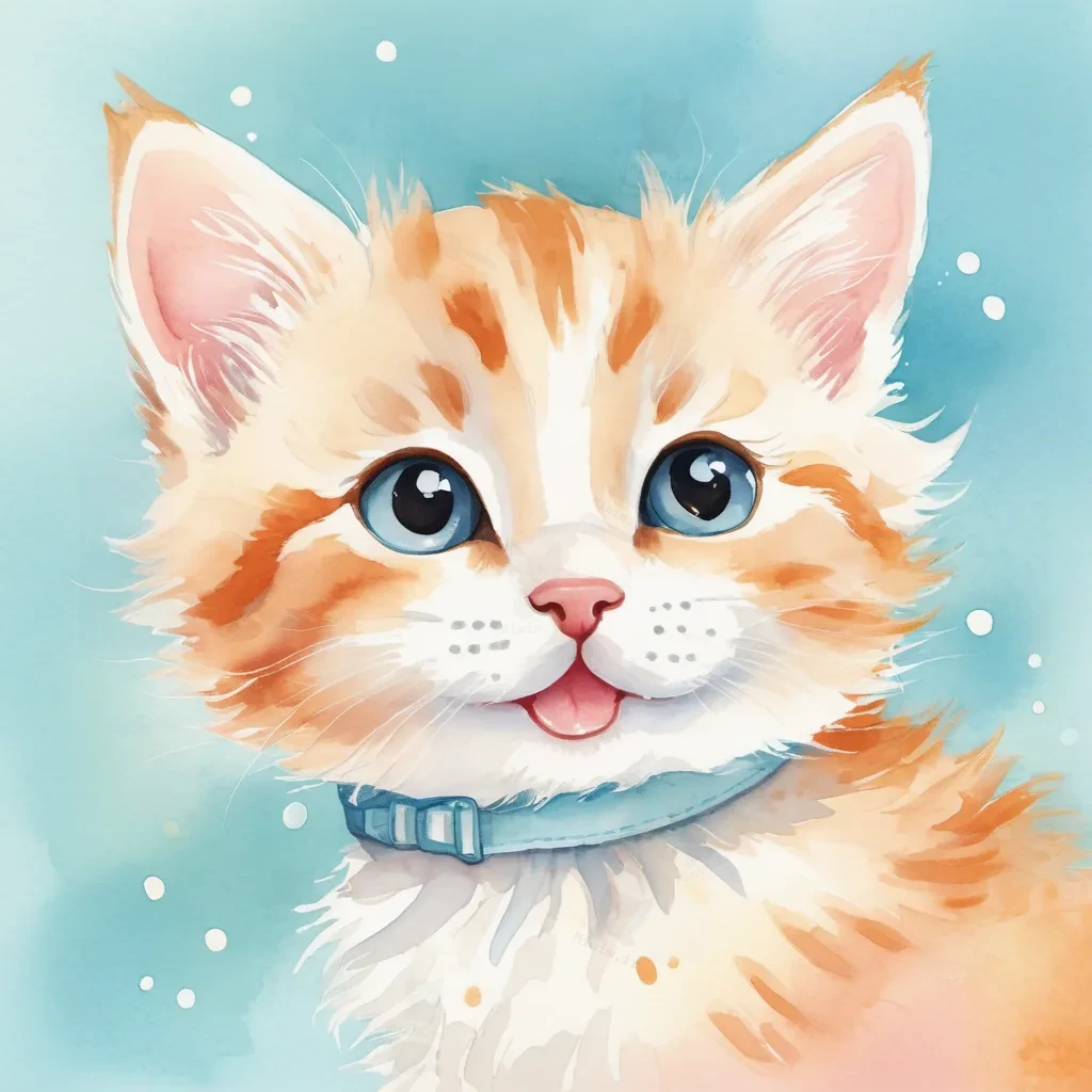 تابلوی «بچهگربه بازیگوش در پسزمینه فیروزهای» اثری لطیف و دوستداشتنی در سبک آبرنگ است که با ظرافت، روحیهی شاد و بیپروای یک بچهگربه را به تصویر میکشد. گربه کوچک با طرحهای نارنجی و سفید در مرکز تصویر ایستاده و یقهی آبیاش ترکیبی دلنشین با رنگ چشمهای آبی درخشانش ایجاد کرده است.