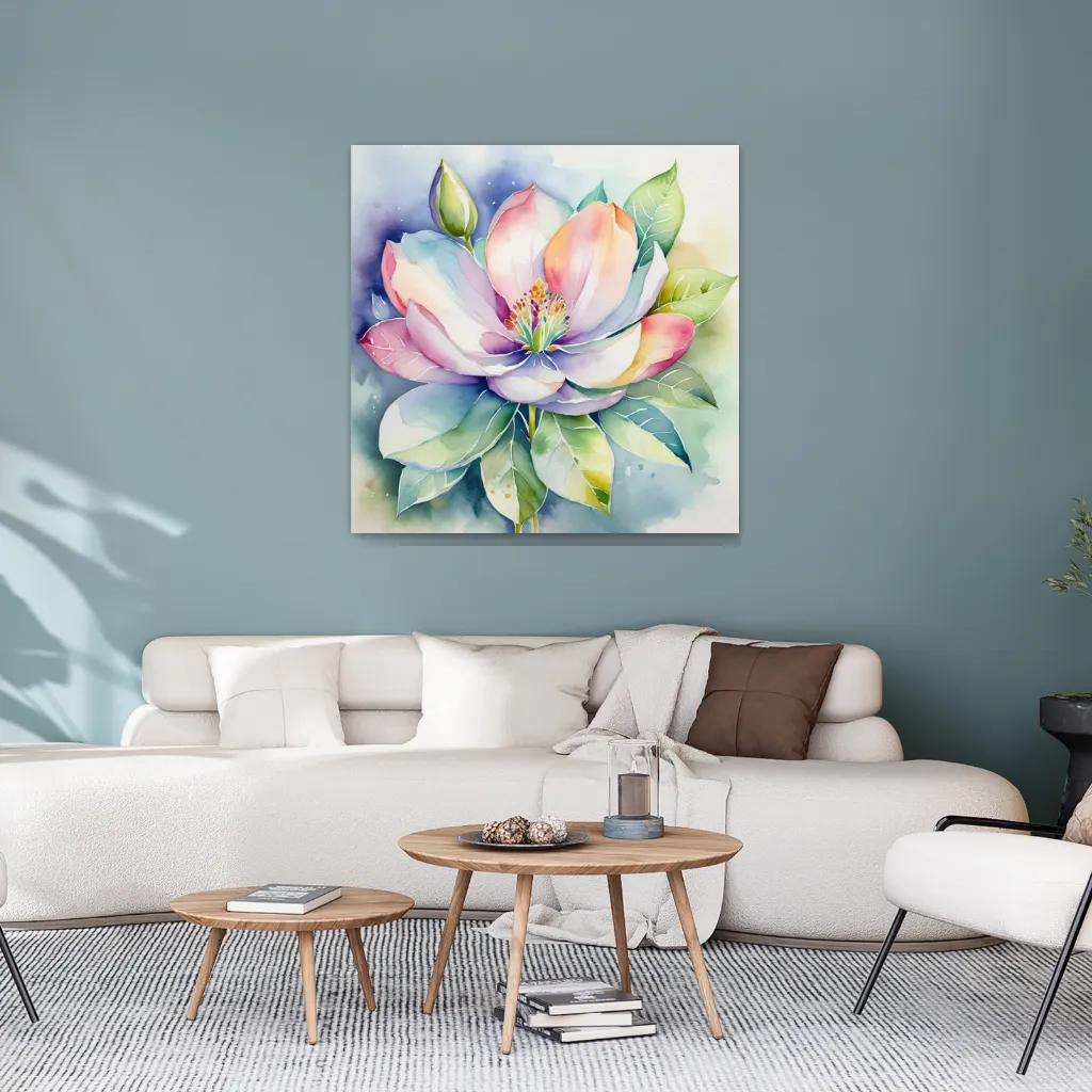 تابلوی آبرنگی از گل ماگنولیا با رنگهای زنده و پسزمینهای ملایم؛ انتخابی لطیف و شاعرانه برای هر فضایی.