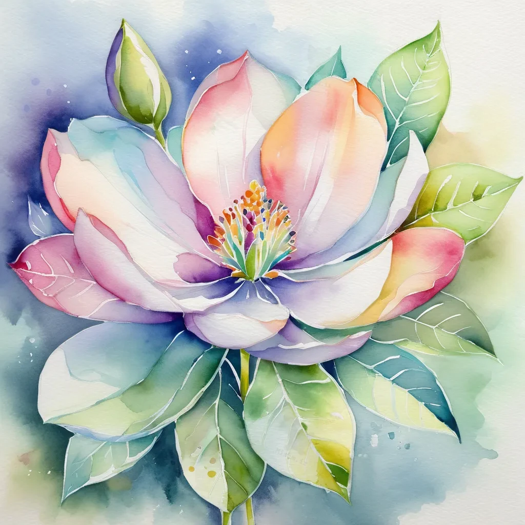 تابلوی «گل ماگنولیا در پسزمینه آبرنگی» با ترکیب رنگهای درخشان و لطافت قلممو، تصویری ظریف و طبیعی از این گل زیبا ارائه میدهد. گل ماگنولیا در مرکز تصویر قرار دارد و با گلبرگهایی در طیف صورتی، سفید و آبی، به شکلی واقعگرایانه و پرطراوت جلوه میکند. برگهای سبز در اطراف گل به صورت متقارن چیده شدهاند و با لایهگذاری هنرمندانه، عمق و بعدی دلنشین به اثر بخشیدهاند.